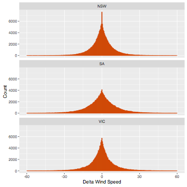 Figure 18. The distribution of the change in wind generation, delta, between 30 minute intervals New South Wales, South Australia and Victoria: September 1 2015 to 16 January 2017.